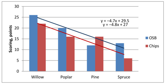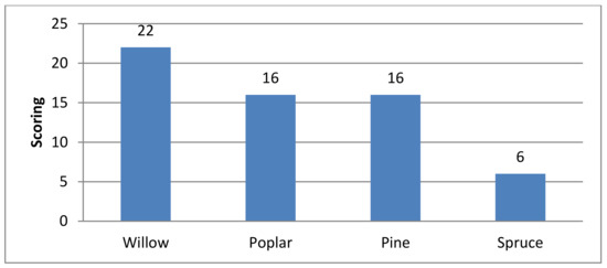 To perform a hierarchy of the quality of the woody species, a sorting algorithm is considered applying a maximum score of four points for the woody species that holds the first place, three points for the second place, two points for the third place, and one point for the last place. It is also considered that there are six criteria, eliminating the equivalent diameter which exclusively depends on the width and thickness of the strands. Summing the obtained score by each species strands, it is obtained the hierarchy from Figure 6.
