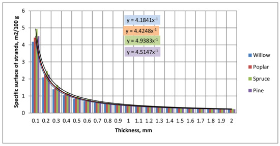 Using this Equation (3), the graph from Figure 7 was obtained. Even though the four regression curves are very close (because wood densities are appropriated), the power regression coefficient types are different for the analysed species. It can be observed that we have very good surfaces of over 1 m2/100 g up to a thickness of 0.5 mm, after which the influence of the thickness on the specific surface is weak and almost constant.