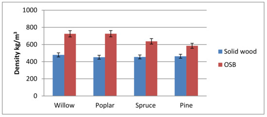 It is observed (Figure 8 and Figure 9) that the density of the OSB boards was about 30% higher than that of the solid wood from which it came, this being determined by the adhesive in the board and the exerted pressure (about 3 MPa) which has compressed and compacted the strand mat. Also, the density of the two species of fast-growing hardwoods was about 12% higher than that of the softwood ones, a fact also observed by other authors [26].
