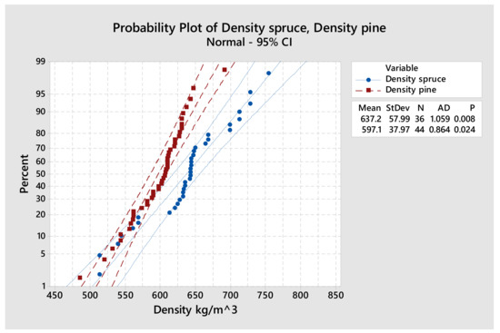 Analysis of variance (ANOVA) with null hypothesis and significance level of 0.05 was used and was obtained a good significance F-value of 4.57%. In this way the range of values was determined for 95% confidence interval as was for spruce species (621.65–652.65). Also, by the same method it was determined Tukey Pairwise Comparisons with the obtained order: poplar, willow, spruce, and pine.