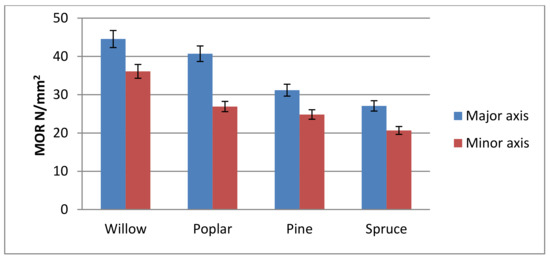 Modulus of rupture (MOR) for OSB boards of willow, poplar, pine, and spruce on major and minor axis.