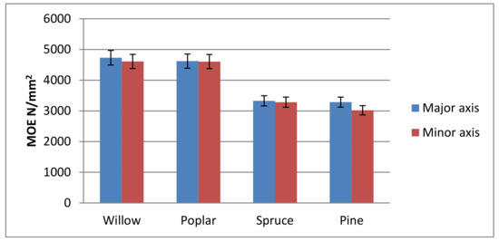 Modulus of elasticity (MOE) for the willow, poplar, spruce, and pine OSB boards on major and minor axis.