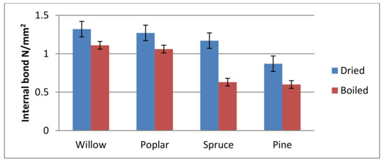 The internal bond of the OSB boards was over 0.87 N/mm2 for the dry boards and over 0.6 N/mm2 for the boiled boards in water for two hours (Figure 12). It is observed that the fast-growing boards (willow and poplar) have values up to 34% higher than the two species of resinous (pine and spruce). The obtained values correspond to the values described by other authors [6], but also with those imposed by the companies that produce their own products [32].