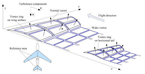 In order to estimate the bumpiness severity of specific aircraft, it is fundamental to build an accurate response model from vertical acceleration to turbulence. It is the longitudinal and vertical components of turbulence that mainly lead to the plunge and pitching motion of aircraft. The Vortex Lattice Method (VLM), which is a common method for analyzing aerodynamic performance of lifting body, can be used to obtain the plunge and pitching motion in turbulent flight. By assigning the horseshoe vortices on the lifting surface, the lifting body is simplified to be a flat surface, forming a planar VLM. As a technical improvement, the non-planar vortex lattices are assigned on the mean camber surface of the lifting body, while the horseshoe vortices are substituted by vortex rings to get more accurate solutions [15]. In aerodynamic performance analysis of small angle of attack circumstances, the VLM is much more efficient compared to the general compute dynamics method, which needs to solve the Navier–Stokes Equations. In recent years, VLM has been widely applied in the design of wind turbine [16], flying wing and flapping wing aerial vehicle [17,18], the optimization of winglet [19], swept wing [20,21], and gust wind response analysis [22]. In some special applications, including the aerodynamic analysis in aerial refueling formation flight [23,24,25] and innovative flap design [26], VLM shows the superior performance of rapid trial-and-error. The Unsteady Vortex Lattice Method (UVLM) is developed to get more accurate solutions because the vortex distribution and wake vortex change induced by unsteady motion of aircraft are considered [20,21,27]. When it comes to the gust response analysis, NASA developed wind shear coefficients based on steady VLM [28,29]. The longitudinal aerodynamic effects induced by wind shear were computed by VLM and added to quasi-static aerodynamic model. Since the rapid-changing turbulent wind is different from low-frequency wind shear, the steady VLM lacks enough accuracy in computing aerodynamic force in turbulence. Instead, if the turbulence-effected aerodynamic performance is obtained by UVLM, a more accurate vertical acceleration response can be acquired, which forms a better basis to obtain an aircraft-dependent bumpiness severity estimation.