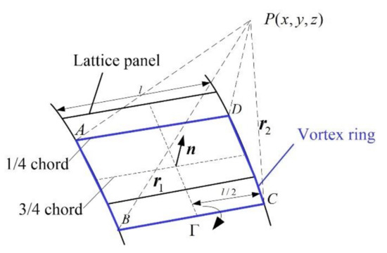 The arrangement of vortex ring is illustrated in Figure 3. According to the vortex lattice method, the leading edge of the vortex ring is placed at the 1/4 chord of the panel, while the Neumann boundary condition of no penetration is enforced by locating the collocation point at the 3/4 chord. In this way, the lift curve slope of the lifting body conforms to the thin airfoil theory [35]. As shown in Figure 3, the induced velocity of the vortex ring is described as the vector sum of the induced velocity superposed by four vortex filaments,
