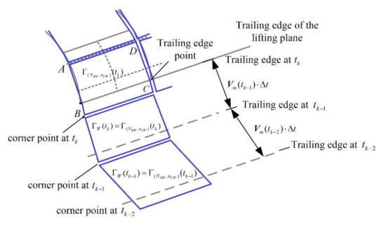 A time-marching computing process is used to perform the unsteady simulation. At each time step , the newly generated vortex rings at the trailing edge of the lifting body are released into the wake. As shown in Figure 4, the wing-tail assembly releases force-free wakes with no aerodynamic loads. The circulation of the newly generated wake panel stays unchanged for the remainder of the simulation according to Helmholtz’s theorem [15].