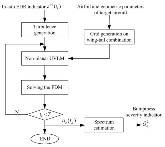 To summarize, an integrated computation flow for the severity estimation of aircraft bumpiness is shown in Figure 7. The grid on the wing-tail assembly of target aircraft is generated beforehand. According to real-time in-situ EDR indicator, a time series of longitudinal and vertical turbulence components is generated by Equation (6). In the algorithm loop, the generated turbulence and flight parameters are used to compute local velocity by Equation (11) firstly. After that, the aerodynamic force in turbulence is obtained by UVLM. Vertical acceleration and related flight parameters necessary for computing local velocity are obtained by solving the flight dynamics model. For each EDR value, the time series of vertical acceleration data is generated based on the input of turbulence components. If each time step of turbulence components is processed, the estimated aircraft bumpiness indicator is obtained by Welch spectrum estimation.
