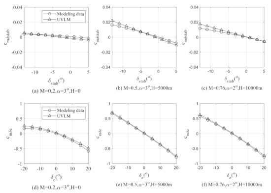 By comparing the computation results with the modeling data, the Mean Square Error (MSE) of is 0.0045 and the MSE of is 0.0055. The fitting curves formed by the computation results show that the pitching moment change caused by the deflection of stabilizer or elevator approximates the modeling data under the above flight conditions.