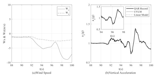 where and are the ground speed components recorded in QAR flight data. According to the QAR flight data of WF5, the time series of and are computed and shown in Figure 9a. With the wind components as the input, both the linear model and UVLM give the response of vertical acceleration. Figure 9b shows the recorded vertical acceleration data (QAR Record), the computed vertical acceleration from the linear transfer function model (Linear Model) and UVLM, respectively. Before 90 s in WF5, the data show the aircraft was at a trimmed level flight condition. From 91.5 s, the aircraft began to experience initial turbulence, approaching the minimum acceleration near 96 s, and then reaching the maximum positive load at 96.8 s. After that, the acceleration showed a continuously decrease. In this short period, the linear model was momentarily out-of-phase once encountering sudden turbulence, while the tracking accuracy was still satisfactory. However, observations from Figure 9 suggest that both linear model and UVLM are able to follow the acceleration response in moderate turbulence, while the tracking accuracy of UVLM is better than that of the linear model.