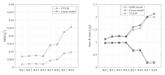 In order to compare the acceleration response more comprehensively, the MSE and absolute peak acceleration in WF1~WF8 are computed and shown graphically in Figure 11. The Linear Model did a good prediction in light turbulence as UVLM. However, the tracking error increased in moderate and severe turbulence. The increase of turbulence intensity leads to bigger MSE in linear model. On the contrary, UVLM is able to track the acceleration response with better accuracy than the linear model.