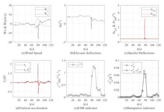 Figure 12 shows in-depth analysis results in WF8. The longitudinal and vertical turbulence components of 120 s are shown in Figure 12a. Between 79 s and 82 s, the aircraft experienced sudden vertical turbulence. At the same time, the deflection of elevators and spoilers recorded by flight data are shown in Figure 12b,c, respectively. It can be found that both the elevator and high-speed flight spoiler experienced big deflections. The deflection of elevators had a greater impact on aerodynamics force than that of spoilers.