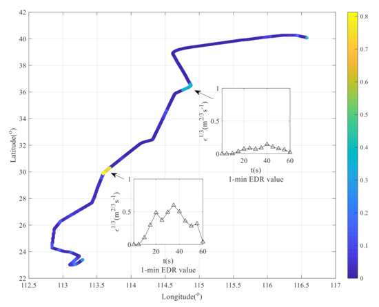 Figure 11e shows the EDR indicator by wind-based estimation algorithm given in [39]. The EDR value is commonly output once a minute. In this paper, in order to analyze the dynamic process of EDR and aircraft bumpiness estimation, the 90th percentage EDR value is given in a sub-window of 10 s with 50% overlap.