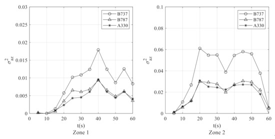 Figure 11f shows the acceleration variation with or without aircraft maneuvers. The turbulence intensity was first obtained by Equation (3) according to the EDR value indicated once a minute. Then the longitudinal and lateral turbulence components were generated by Equation (6) in a sampling frequency of 8Hz. With the turbulence components as the excitation, the time series of vertical acceleration is computed by UVLM. After obtaining the acceleration response, the data length of one-minute vertical acceleration data is 480 points. In the process of bumpiness severity estimation, the band-pass frequency and are typically chosen as 0.1 and 1.0 Hz respectively for civil aviation aircraft. The one-minute acceleration data are further divided by six sections, while the length of Tukey–Hanning window is set as 160 and the overlapping is set by 50%. Figure 12f shows the total variance estimation, , which is blended by aircraft maneuvers. In the computation process of incremental acceleration, the effects of control surface deflection are eliminated by . It can be concluded that during the severity estimation of aircraft bumpiness, the acceleration response model based on UVLM is capable of effectively avoiding the adverse effects of aircraft maneuvers.