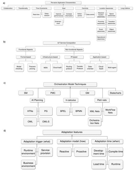 In [27], Asghari proposes a taxonomy for service composition on IoT platforms. The main classification considers functional and non-functional aspects of the composition, with functional ones being formal, such as model checking and theorem proving; and non-functional ones being infrastructure-based (such as wireless sensor networks or the cloud), IP-based (such as routing or transfer protocols) and application-based (such as data-oriented or multi-agent systems).