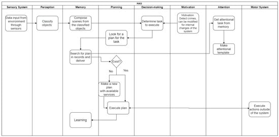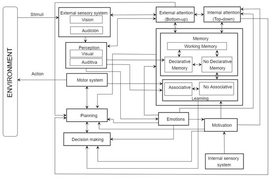 - Attention agent: In humans, this function’s goal is to use resources available in the system [55] efficiently. In our system, this agent builds an attentional template from the attentional task established. Using this template, it recovers information from memory to assist the perception, memory, planning and decision-making agents in meeting their goals efficiently.