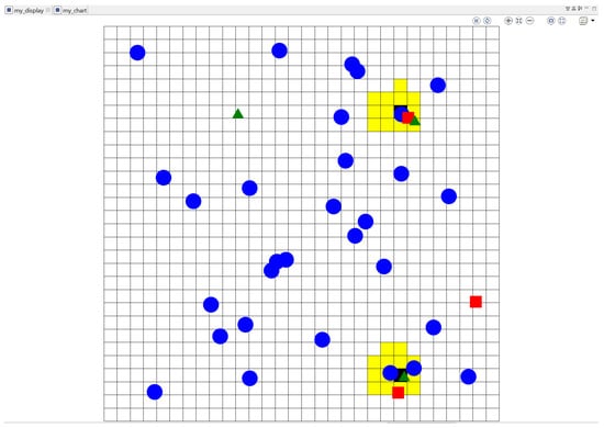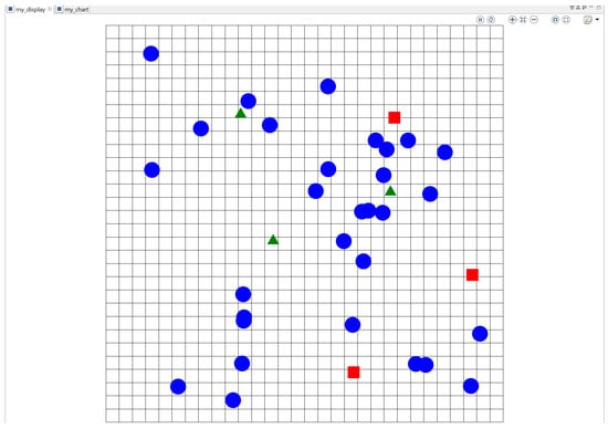 Figure 5 shows the environment implemented. This environment shows the streets and circles, squares and arrows representing the different types of agents. Blue circles represent the passersby; green arrows represent the drones; red squares represent the criminals. For this simulation, we decided not to represent the other agents visually. However, these agents interact with the environment and are considered omnipresent for the sake of this simulation.