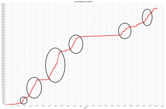 With this we successfully got our system to work and detect the situations as intended; more importantly, we can see that our system communicates and coordinates within itself and gets the work done. In Figure 7 we can see the number of messages sent by our system: at first it sent a high number of messages because of the initialization, the Contract Net and the agree messages and the start of the reflex for the agents to detect situations; after that, only when it detected a risky situation and it had to create a service did we get a rise of messages, as seen in the circles on the graph. With this simulation we confirm that our system will behave as we intended and have an impact on our lives. We can see that it can coordinate itself to meet the expectations using the FIPA messages. Still, there is work to be done, especially with-real-world data.