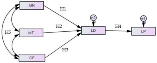 The PA was developed in six steps: (1) specification: establishment of the study variables; (2) identification: determination of the information to compare the model; (3) parameter estimation: obtaining the values that best fit the observed matrix; (4) fit assessment: determining whether the relationships between the estimated model variables reflect the relationships observed in the data; (5) model re-specification: improving the model fits; and (6) interpretation of results [32,33,34]. For this purpose, the model presented in Figure 1 was proposed, which integrates the study variables: Mentoring (MN), Motivation (MT), Communication and Feedback (CF), Learning Design (LD), and Learning Performance (LP).