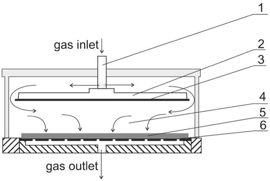 The scheme of the reactor. The arrows indicate the direction of the gas flow. 1 = gas inlet, 2 = high-voltage electrode, 3 = dielectric barrier, 4 = discharge gap, 5 = modified sample, and 6 = grounded electrode [25].