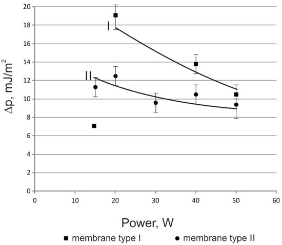 The effect of the discharge power generated in carbon dioxide on the polar and dispersive component and the surface free energy of the membranes MI and MII was investigated. The tests were carried out using an exposure time of 15 s and a discharge power of 15–50 W.