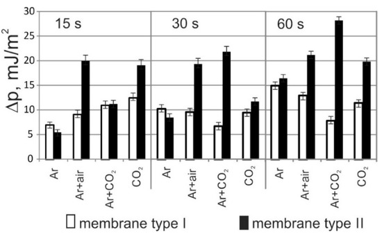It was also found (Figure 3) that increasing the discharge power above 20 W harmed the most important membrane parameter: the polar component. ∆p decreased from 12.5 to 9.4 and from 19.1 to 10.5 for MI and MII, respectively. This was probably the result of the change of the membrane’s surface size and the decay of the roughness caused by melting the membrane’s surface. In the rest of the studies, the discharge power was 20 W, the exposure time varied in the range of 15–60 s, and the gas composition, in which the discharge was generated, was changed.