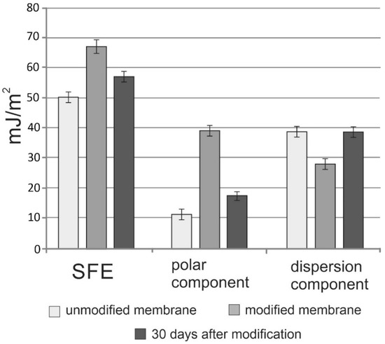 The analysis of the obtained results and literature data [15,16] allows us to state that the plasma modification was not a permanent process. A significant reduction of the polar component and an increase of the dispersion component to the value before modification were observed. The SFE decreased by 13% compared with the sample shortly after modification. This effect is unfavorable and could have been caused by the disappearing of polar functional groups from the surface, drawn into the volume of the material [12]. However, the polar component of the membrane after 30 days was 6.5 mJ/m2 higher than that before modification.