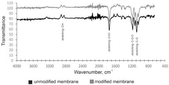 The unmodified samples, as well as the samples shortly after modification, were tested by FTIR-ATR analysis. Due to the high similarity of the results obtained, only an example spectrum for the tested materials was presented. On the FTIR-ATR spectra of the membrane surface after modification, no significant changes in the surface layer were observed (Figure 8). This may have been because the material undergoing the modification had oxygen-containing groups in its composition. Subsequent functional groups introduced during the process had no significant effect on the appearance of the spectra.