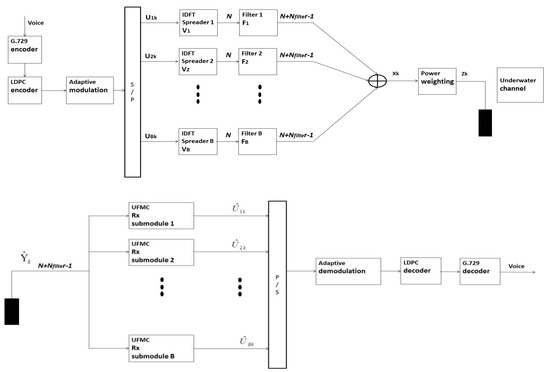 First, a voice signal was used as the input of a G.729 encoder, and then extracted a voice G.729 bitstream as the output. This voice G.729 bitstream was then used as the input of a (2000, 1000) LDPC encoder, and a voice LDPC bitstream was extracted as the output. A voice LDPC bitstream was applied to an adaptive modulation scheme with 4-QAM, and 16-QAM, with adaptive QAM symbols were extracted as the output. The proposed scheme adopted carrier sense multiple access with collision avoidance (CSMA/CA) for multiuser communication. The UFMC solution was integrated into the proposed underwater voice transmission technology. The baseband adaptive UFMC transmitted signal for the kth user is expressed as follows: