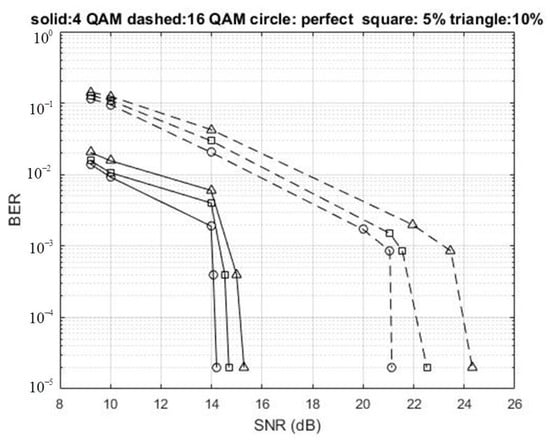 Figure 2 depicts the BER performances of the UFMC-based underwater transceiver with an LDPC code, PCE and CEEs of 5% and 10%. The circle, square, and triangle symbols denote the BER performances with PCE and CEEs of 5% and 10%, respectively, in Figure 2, Figure 3 and Figure 4. The solid and dashed lines denote the BER performances using 4-QAM, and 16-QAM, respectively, in Figure 2, Figure 3 and Figure 4. The Matlab-based underwater channel model [26] was adopted. The parameters of the adopted MATLAB-based underwater channel model are listed in Table 2. The transmitter was set 3 m beneath the sea surface, the receiver 2 m beneath the sea surface, the water 14.5 m deep, the direct path at a range of 100 m, the carrier frequency at 40 kHz, and the channel bandwidth at 20 kHz. In the underwater channel model, the water sound speed was 1539 m/s. In addition, the channel delay profile was generated by using a MATLAB-based underwater channel model [26].