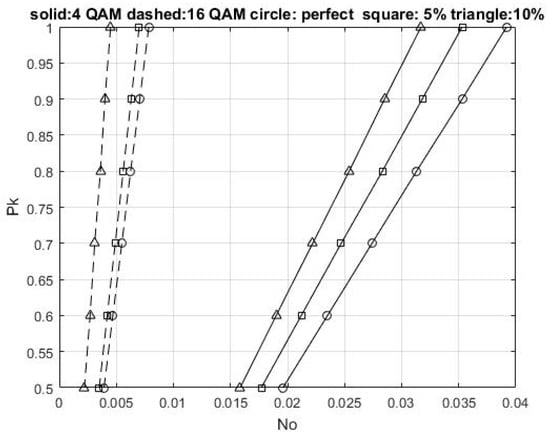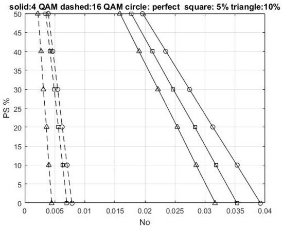 For 16-QAM, the power saving ratios for the No of 0.0045, 0.0040, 0.0036, 0.0031, 0.0027, and 0.0022, were 0%, 10%, 20%, 30%, 40%, and 50%, respectively, at the proposed system with a BER of , for CEE of 10%. The 4-QAM outperformed 16-QAM, under a CEEs of 10%, with No gains of 0.0136, at a power-saving ratio of 50%. The No of 16-QAM was lower than that of 4-QAM.