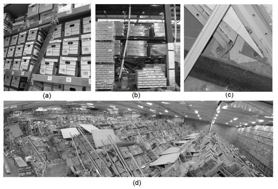 Different rack failure mechanisms during the Christchurch earthquake: (a) down-aisle mechanism, (b) down-aisle mechanism, (c) baseplate deterioration in cross-aisle direction, (d) progressive collapse of the entire system.