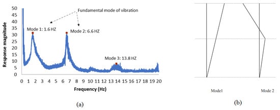 (a) Fast Fourier transform (FFT) of sine sweep test of the specimen before being exposed to any seismic actions, (b) first and second modes of vibration observed in sine sweep test.