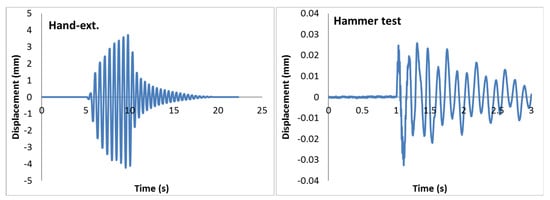 Identification of damping: Damping is an essential factor in the seismic field. A hammer test and a hand exciting test were conducted to measure the preliminary damping coefficient of the system before performing the shake table tests. In the former method, different parts of the rack were excited by hammer impact, while in the latter approach, the rack was shaken for three cycles and then was left to have free vibration. It should be noted that the damping ratio was also determined by the sine sweep test after each shake table test, to compare the damping ratio before and after motion.