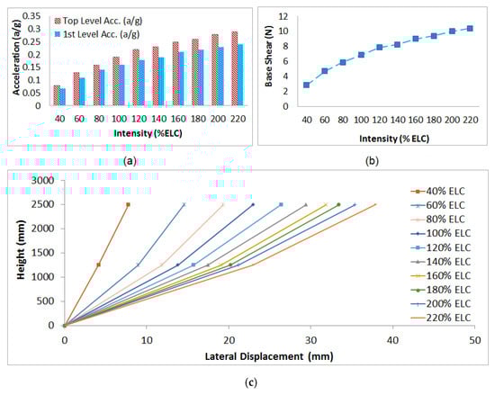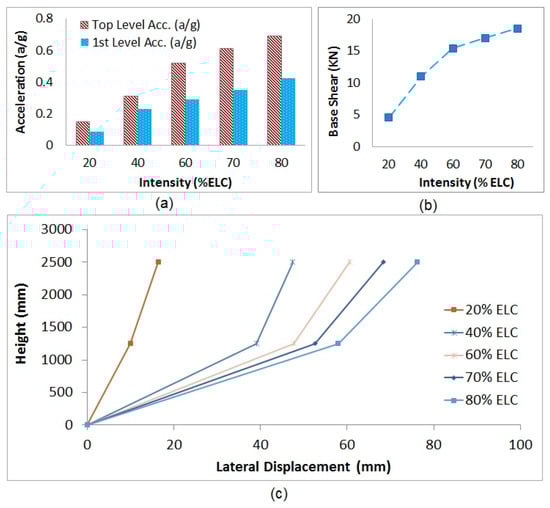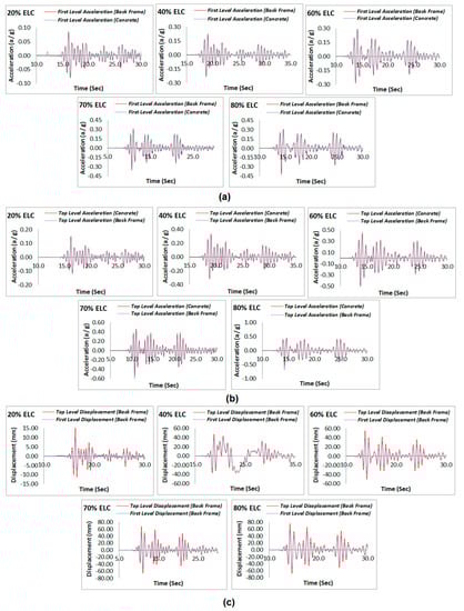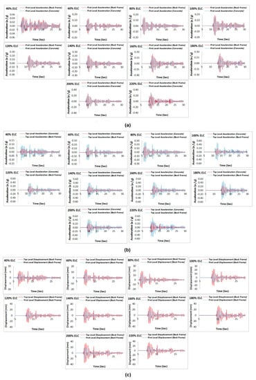 Structural response under 20–80% intensity of El-Centro (ELC) earthquake record—Non-Scaled in time domain: (a) accelerations in first level, (b) accelerations in top level, (c) displacements in frame.