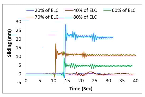 Figure 11 shows the structural responses under 20% to 80% intensity of the El-Centro earthquake record without scaling the time domain in terms of accelerations in the top and bottom levels and the lateral displacement of the rack frame. The experimental data of the back frame are only shown in this figure since the results of the front and back frame were almost identical, indicating that no rotation occurred during the tests. It was decided not to subject the specimen to a record greater than 80% of the El-Centro earthquake as the recorded acceleration of the top-level indicated a peak acceleration near “1.0 g”, which was close to the capacity of the shake table under a 4-tonne structure. As shown in Figure 12, pallet sliding occurred in all specimens; however, no significant pallet movement was observed during the tests with intensities of 20% and 40%. Sliding was much more pronounced for intensities of 70% and 80%, with maximum sliding of around 27 mm and 18 mm in the top pallet, respectively. For this reason, the top pallet acceleration (Effective Design Acceleration (EDA) started to deviate from the acceleration that was recorded from the accelerometer mounted to the upright, as shown in Figure 12.