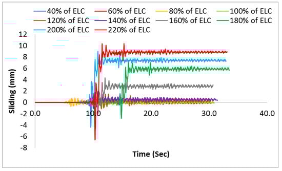Figure 14 shows the structural responses for the ground motions with 40% to 220% intensities of El-Centro earthquake records with 20% increments in the scale time-domain condition. As shown, increasing the excitation intensity typically resulted in an increase in the acceleration of the system and the lateral displacement of the rack. In addition, from the test data, it was found that the front frame responses were almost identical to the back-frame results for all specimens. This indicates that the frames tended to deform as rigid bodies at each level with equal deformations at either side. As shown in Figure 15, pallets started to significantly slide on the beam after 160% intensity tests. This can be explained by the reduction in the friction coefficient between the timber pallet and the beam due to the large number of tests using the same pallets and beams, which smoothed the contact surfaces of the timber pallet with the beam flange. The tests were continued until the automatic acceleration sensor raised an alarm of reaching a high acceleration at the top level close to the table capacity during the 220% intensity test. The peak responses of the rack structure under the scaled time domain are given in Table 4.