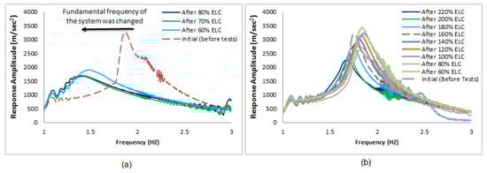 Figure 19 shows the frequency–response curves of the sine sweep test results used to obtain the damping ratio as well as the fundamental period of vibration. For the non-scaled tests, the period was visibly changed due to the apparent damage of the system in dissipative zones (e.g., connections), and the system lost stiffness. The increase in the damping ratio due to enhancing the intensity of the earthquake can also be seen in the graphs by focusing on the width of the curves that were broadened.