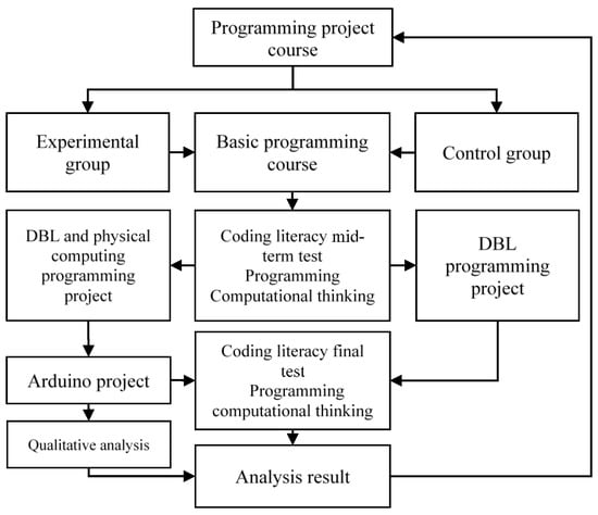 This DBL Arduino project course adopted a phased teaching content design, including a “Basic Programming Course” (8 weeks) and “ Arduino Advanced Course” (3 weeks). The basic course aimed to strengthen the students’ programming abilities, considering the differences between students in terms of their programming abilities, using several examples, and designing different levels of questions to understand their different levels of learning effectiveness. The advanced course focused on applying Arduino, providing students with opportunities to try and solve problems. The majority of students acquired programming abilities step-by-step through learning the above phased teaching content [38]. The experimental student group performed significantly better than the control group in terms of advanced programming abilities in multi-condition judgment, repetitive structure, and comprehensive applications.