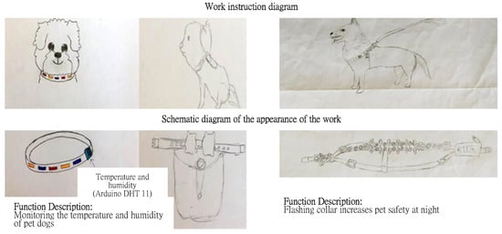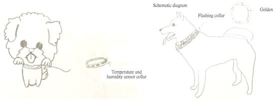 Through various discussions, the students decided on the best pet observation tool. The teacher guided the students to observe the interaction between pets and owners in an empathetic way to make new discoveries and to uncover people’s deeper needs. Most groups chose dogs as the most popular pet. The reason for this is that many families have raised dogs, and they understand their habits in daily life. Thus, as a functional plan of wearable pet devices, the student groups were asked to draw preliminary design sketches of the wearable devices discussed, as shown in Figure 3.