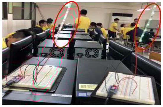 In terms of the application of Arduino programming, an open and independent learning environment was created to inspire students’ imagination through group cooperation and discussion. Thus, they were asked to understand obscure concepts of science and program coding. For example, students hoped to apply the sensing principle of photosensitive resistance to wearable devices. However, most students easily made mistakes in the relationship between light and resistance. The teacher helped the students learn how to change the light level of the photosensitive resistor through an actual experiment. In this way, students could successfully simulate the Arduino learning platform and to complete an LED light bar function test, as shown in Figure 4.