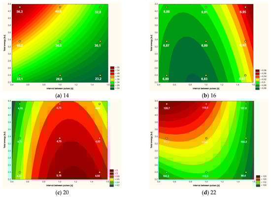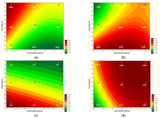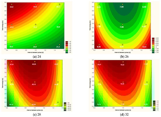 The temperature increase of hen egg white after the CMF treatment in the range from 0.5 to 1.5 s in the case of the variable “CMF pulse interval” and from 2.40 to 4.32 kJ in relation to the second variable, i.e., “total amount of energy supplied to the system” is shown in Figure 2a. The estimation determined with the help of “response curves” can be considered only in the given ranges of variability, which applies to all graphs of this type presented in the paper. In the case of an increase of the temperature of egg white, the greatest changes in this value took place when higher doses of energy were applied to the system, i.e., greater than approximately 4 kJ, with simultaneous shorter intervals between pulses, i.e., not greater than 1 s. In the given range of variables, the greater impact on the final temperature increase had the distance between the pulses, and the smaller amount of energy supplied to the system, which is represented in Figure 2a by isothermal lines running in the vast majority (in the given range of variability) at an angle greater than 45° in relation to the OX axis. In the case of the variability range above approximately 1 s (in relation to the intervals between pulses) and below approximately 3.5 kJ (in terms of the total amount of energy supplied to the system) we have the opposite situation. In this area of variability, the increase in temperature of hen egg white was mainly influenced by one variation factor, i.e., the amount of energy supplied to the system, which is visible in the system of isothermal lines running at an angle much smaller than 45° with respect to the OX axis. The absolute temperature increase of egg white in this area was much smaller (to approximately 31 °C) than in the first discussed range, where this value was over 48 °C.