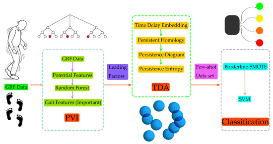 The processing framework of this study is divided into three parts: variable importance (PVI) analysis, topological data analysis (TDA), and severity classification. In the analysis of the importance of variables, the GRF data were first categorized according to the data in each gait cycle. The gait characteristics of each cycle were calculated, and the variable importance was ranked to select the most significant ones. In the TDA, phase-space reconstruction was carried out for each gait feature, and a persistent homology method was used to extract topology marks to obtain persistent scatter plots, then the persistent entropy of persistent scatter plots was calculated. In the stage of classification, the Borderline-SMOTE method was used to balance the samples, then the Support Vector Machine (SVM) was used to classify the data and obtain the obfuscation matrix for performance analysis.
