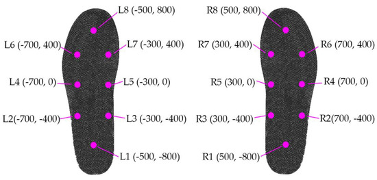 The pressure sensors L1–L8 and R1–R8 under the left and right feet, respectively.