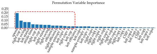 Results of permutation-variable importance. The red dotted line surrounds the variables that were considered to have a greater impact on the disease category of gait. The number of decision trees in RF was N = 10,000, and the maximum depth was 5.