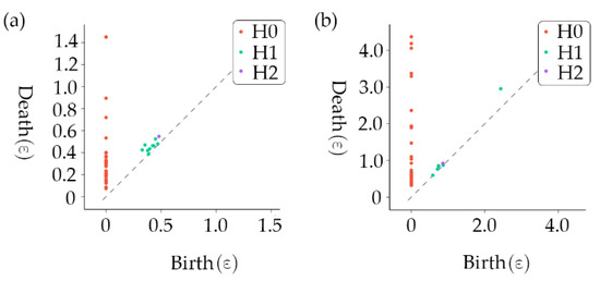 After mapping the time series of the gait characteristics to the topological space, we could extract the relevant topological imprints and apply them to the data analysis. This research adopted a method of topology-imprint analysis based on persistent homology to extract topology features. Each gait characteristic data point mapped to the topological space can be regarded as a small ball with initial radius = 0 (0-dimensional homology structure). As increases, the balls may intersect and fuse into connectomes (1-dimensional homology), and as increases further, the balls may surround holes (2-dimensional homology). However, as the radius of a small sphere continues to increase, these connectomes or holes will disappear, which means that these homology structures have a specific duration. We recorded homophones for time of birth and time of death, which we called the persistent homophones, resulting in the topological stamp. A persistence diagram was obtained for each homology structure by plotting a graph with the times of birth and death as the axes, as shown in Figure 5.