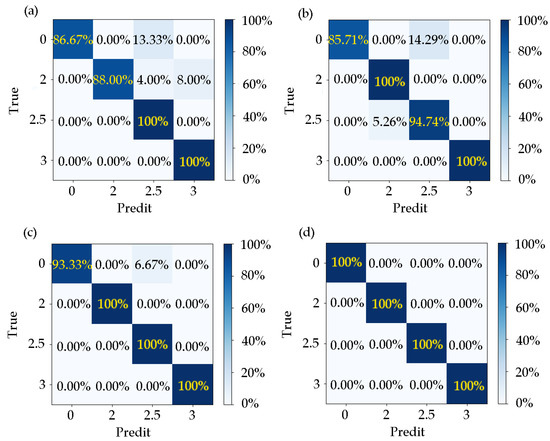 The confusion matrix of the test results with 50–80% (confusion matrix (a–d)) of the samples.