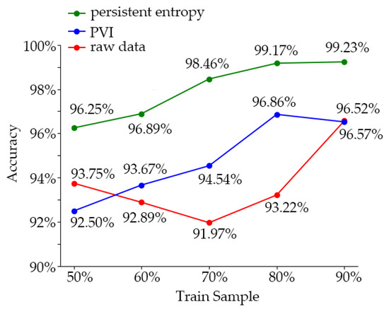 The training accuracy of the raw data, permutation-variable importance processing and persistent entropy.