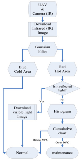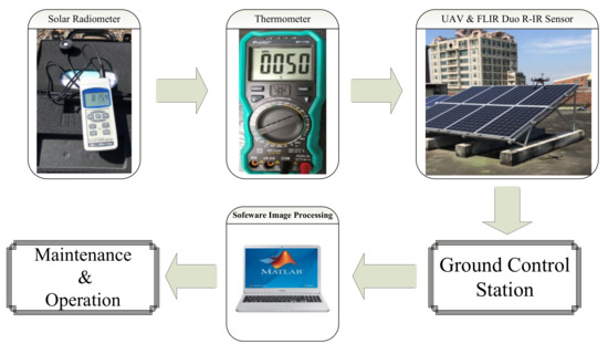 In recent years, many countries are actively developing renewable energy-related industries, and the construction of solar power plants is regarded as an important part of it. Taipower (a government power agency in Taiwan), for example, has stated that 2019–2020 is a bumper year for large-scale development projects, and it is expected to achieve the target of 2.2 GW solar installations set by the Ministry of Economic Affairs. Meanwhile, Taipower is expecting to complete its annual production plan of 6.5 GW before the end of 2021 [1]. It is believed that solar energy will become one of the most important renewable energy sources in Taiwan. However, the maintenance and monitoring will be a challenge as many large scale solar farms are operated and built in remote area and some panels are even installed on top of high rise buildings. The panel temperature is an important factor to determine its efficiency. For example, when the temperature increases by 1 °C, the power generation efficiency of solar modules decreases by 0.5% [2,3,4]. Therefore, an accurate and efficient way of monitoring and identifying the failure of solar modules is essential [5]. In addition, rapid detection of solar module failures can extend the service life and maintain the performance of the solar system [6]. To improve the detection efficiency, this paper proposes a fast, time-saving and real-time detection system to identify the failure status of solar panels. In this study, a drone equipped with a set of high-definition cameras with infrared and visible light functions was adopted to inspect the health conditions of a solar farm. Advantages of using drones include large area coverage, high flexibility, light weight, and fast speed, and thus module defect detection can be performed in a relatively short time after the shooting status is sent back to the ground station [7]. Lastly, the image analysis with MATLAB is conducted to determine the status of these modules.