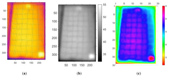 The pixel in an IR image is composed of different ratios of RGB. In response to this, converting the image from RGB to grayscale becomes the first step. This procedure not only enhances the resolution of the image but also facilitates color judgment of the image. Synchronously, filters are necessarily applied to eliminate noise and reduce the sharpness of the image. In fact, filtering techniques are adopted to pre-process the image prior to the detection of faults. In this study, Gaussian filters are applied to reduce noise and other unnecessary details in IR images. Normally, defects such as hot spots and cracks can affect the temperature uniformity on the solar panel module and result in different colors in the IR image. However, noise may also occur in the IR image that real defects may be misinterpreted. Normal components and defective areas on the solar panel module, without the interference of noise, can be clearly distinguished under the filtered image, as shown in Figure 4. The original IR image was grayscale-processed follow by a division of black and white pixels of the image, as shown in Figure 4b, representing cold areas and hot spots on the surface of the solar module respectively [8]. To show the defect more clearly, it is necessary to convert it to an RGB image as shown in Figure 4c. After the conversion, the green area shows up to represent cold zone and the red area the hot zone. The correspondence between color and temperature is shown in the color bar. The lowest temperature in this image is 35 °C and the hottest area is at 55 °C.