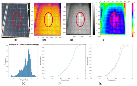 The third panel has no defected cells but several drops of bird guano can be observed on the central middle of panel. This experiment tested irregular shaped hot spots that are often found in remote area. Figure 8a shows the image of the panel obtained through a visual light camera. It is found that bird droppings could not be easily differentiated from its background by visual inspection because both the bird droppings and cells are of black color. Figure 8b shows the original IR image with a bright color region at the central middle part of the panel which is the location of bird droppings. However, it is not brighter than its surrounding and it could be easily overlooked only by visual inspection of the IR image. Figure 8c shows an image converted to grayscale after Gaussian filtering and it shows a clearer image of bird droppings than that in the original IR image because the grayscale magnified the color difference of image. Figure 8d displays an artificial color image based on the grayscale of each pixel after Gaussian filtering. In Figure 8c,d, the hot spot area is more obvious than that in Figure 8b (as shown in the red circle). Unlike the rectangular shape of hot spot shown in Figure 6c, which is caused by failed cells, the hot spot in Figure 8e is of irregular shape. Figure 8f displays the histogram of the PDF of the temperature values in each pixel and the bump with 45 °C is panel frames. The mean temperature is 48 °C with the deviation of −7 °C. The maximum temperature is 55 °C and the minimum temperature is 31 °C. The cumulative chart of CDF is shown in Figure 8f. The percentage of the hot spot area over 50 °C can be obtained from the cumulative curve, which is 5.5% in this panel. The above description shows that 94.5% of the panel is within the normal area, as shown in Figure 8e,f. Lastly, Figure 5e and Figure 8f are superimposed to form Figure 8g for comparing normal operation and abnormal conditions. It seems that there are about 3–4 abnormal cells and the hot spot area in Figure 8d is irregular and thus it is concluded that those 3–4 abnormal cells are caused by stains.